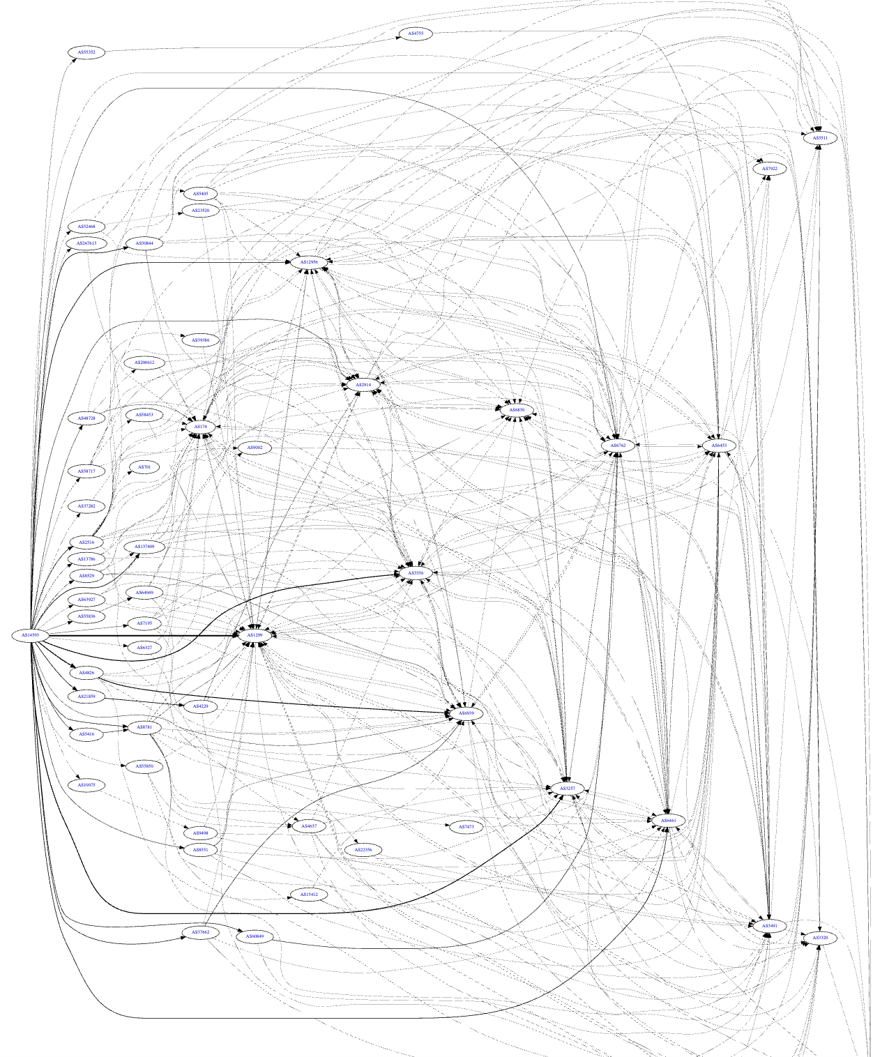 Hurricane Electric’s Graph_v4 for AS14593 shows a rather complicated graph because they have different upstreams at different locations.