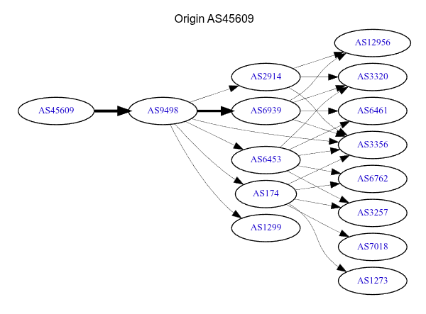 Output is here. Basically, the Singapore route is not there at all. Hence it seems like a special setup where AS3356 peers with AS9498 in Singapore, keeps the route local for APAC and does not export them in US/EU PoPs, etc. The same is reflected by Asia Vs non-Asia downstreams of AS3356 when they feed routes to public collectors and hence multiple paths. Since there isn’t a peering in the US/EU with AS9498, they would pick one of the few upstreams of AS9498, depending on their lowest IGP metric cost (or the oldest route if IGP metric cost is the same).